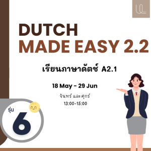 คอร์ส Dutch Made Easy A2.2 เป็นการเรียนภาษาดัตช์ ต่อจาก ระดับ A2.1 ประกอบด้วย 6 Thema (Thema 15-20)